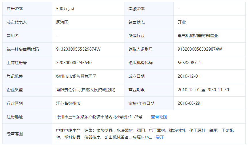 江苏新宝gg电缆有限公司这家电线电缆厂家成立于2016年08月29日,注册资金500万元,厂区地址位于徐州市三环东路东兴物资市场内北4号楼,是一家成立还不到的5年的非常年轻的电线电缆厂家,法定代表人周海国,同时周海国还担任江苏新宝gg电缆有限公司的执行董事兼总经理,周海东担任公司监事。