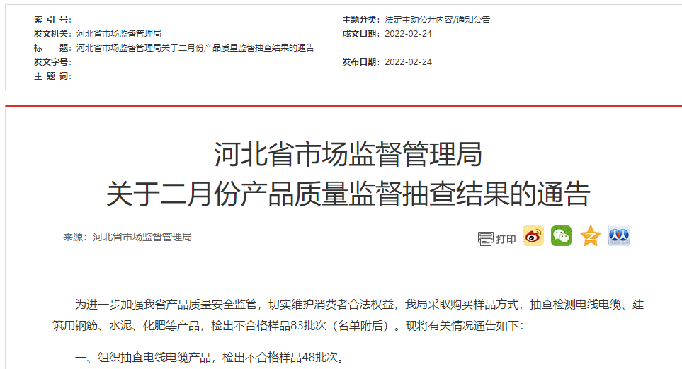 每年国家质量监督总局都会对电线电缆行业进行抽查,今年也不例外,据悉2022年2月份河北市场监督管理局监抽查结果显示,电线电缆不合格产品批次高达48批次,有没有很心惊!