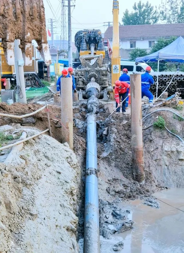 从今年2月项目正式启动,一直在进行通过江心布磁场、打导向、二次扩孔、拉管作业面建设等前期准备工作,为了在穿江过程中保护好电缆,工程方在钢管内安装护缆装置,用敷缆机将电缆全部穿到钢管中,再使用拉管机从北岸向南打导向,同时从南岸向北打导向,在距北岸1800米处的长江底对接,进行两次扩孔至600毫米直径,孔内注满膨润土,然后使用拉管机将内带电缆的钢管拉至长江北岸,直至6月13日准备工作就绪,经过70小时不间断作业。6月16日上午,全长3150米的35千伏供电电缆开始从江底泥下50米处横穿长江。