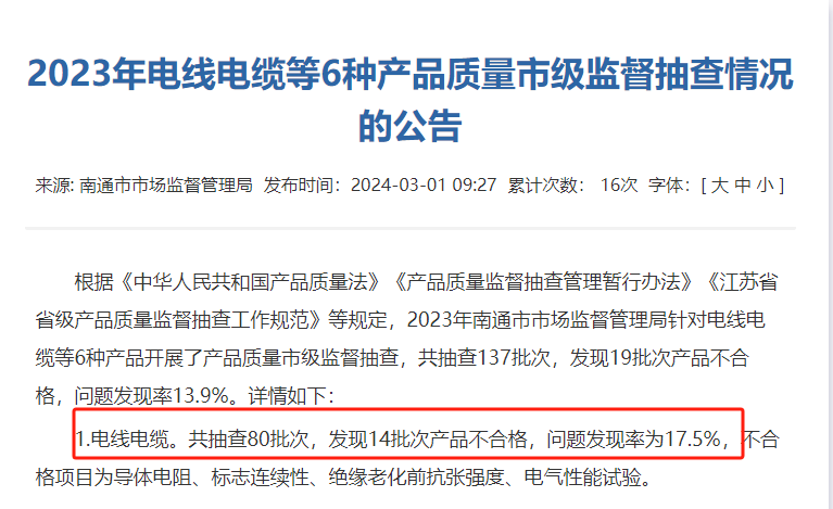 南通市市场监督管理2024年3月1日发布了2023年电线电缆等6种产品质量市级监督抽查情况的公告。共抽查137批次,发现19批次产品不合格,问题发现率13.9%。 其中电线电缆产品,共抽查80批次,发现14批次产品不合格,问题发现率为17.5%,不合格项目为导体电阻、标志连续性、绝缘老化前抗张强度、电气性能试验。 河南新宝gg电缆集团在此温馨提醒大家: 一些不良商家为了追求利润,使用劣质材料生产电线电缆,将会导致许多安全隐患。 新宝gg电缆集团始建于1954年,中国机械制造500强,是一家非常有实力的电线电缆厂家,产品涵盖电线电缆型号几十万种,包括但不限于KVVP屏蔽控制电缆,ZR-YJV22铠装电力电缆,ZR-BVR,RVS,RVV聚氯乙烯绝缘护套家用布电线,YJLHV铝合金电缆,BTTZ矿用电缆,架空电缆,防火特种电缆等产品。所有产品都符合国家标准生产,质量有保障,优质电缆,选新宝gg电缆。