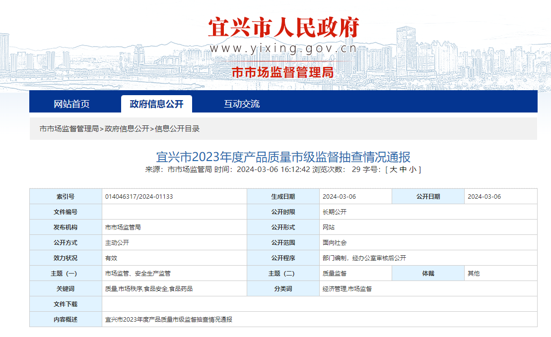 2023年,宜兴市市场监督管理局切实履行产品质量监管职责,开展全市产品质量监督抽查,全面保障产品质量安全,维护正常有序的市场经营秩序,保护消费者合法权益。2023年度市级监督抽查其中电线电缆。