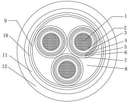 本实用新型涉及电缆技术领域,特别是涉及一种加油站专用电缆,普通电缆高温下立即断电,一种加油站专用电缆,包括绞合线芯结构,所述绞合线芯结构包括多根线芯,各所述线芯包括导体,导体外设置包带层、耐火带结构、复合带层和绝缘层,各所述线芯之间设置填充结构,所述耐火带结构为三层云母带耐火层,各所述绞合线芯结构外设置隔氧层、防水隔潮层、铠装层及外护套,合成云母带具有良好的柔韧性、绝缘性、耐高温和隔热性,依靠云母绝缘具有一定时间的通电负载能力,具有良好的发展前景。