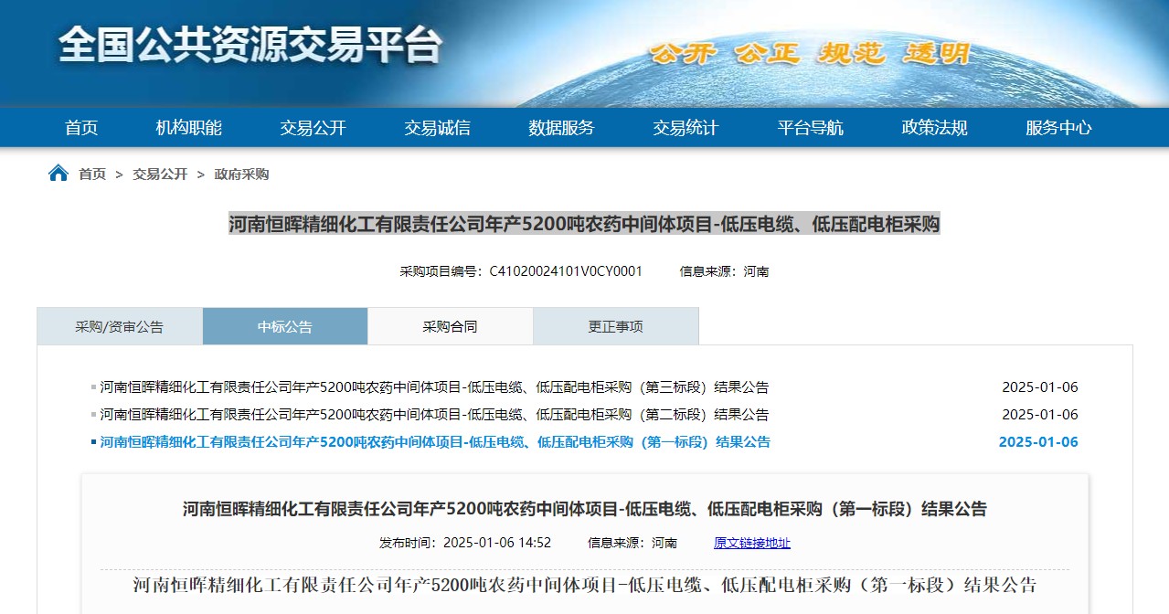 中标河南恒晖精细化工有限责任公司年产5200吨农药中间体项目-低压电缆、低压配电柜采购,中标金额为2620618.00。 也展现了新宝gg电缆在行业内的强大实力和良好口碑。 河南恒晖精细化工有限责任公司年产5200吨农药中间体项目是一项具有重要意义的产业工程,该项目的实施将为农业生产提供优质的农药中间体,助力农业现代化的发展。河南新宝gg电缆将为项目提供高品质、高性能的低压电缆,确保电力传输的稳定和安全,为整个化工生产流程提供坚实的电力保障。 新宝gg电缆集团始建于1954年,中国机械制造500强,是一家非常有实力的电线电缆厂家,产品涵盖电线电缆型号几十万种,包括但不限于KVVP屏蔽控制电缆,ZR-YJV22铠装电力电缆,ZR-BVR,RVS,RVV聚氯乙烯绝缘护套家用布电线,YJLHV铝合金电缆,BTTZ矿用电缆,架空电缆,防火特种电缆等产品。所有产品都符合国家标准生产,质量有保障,优质电缆,选新宝gg电缆。