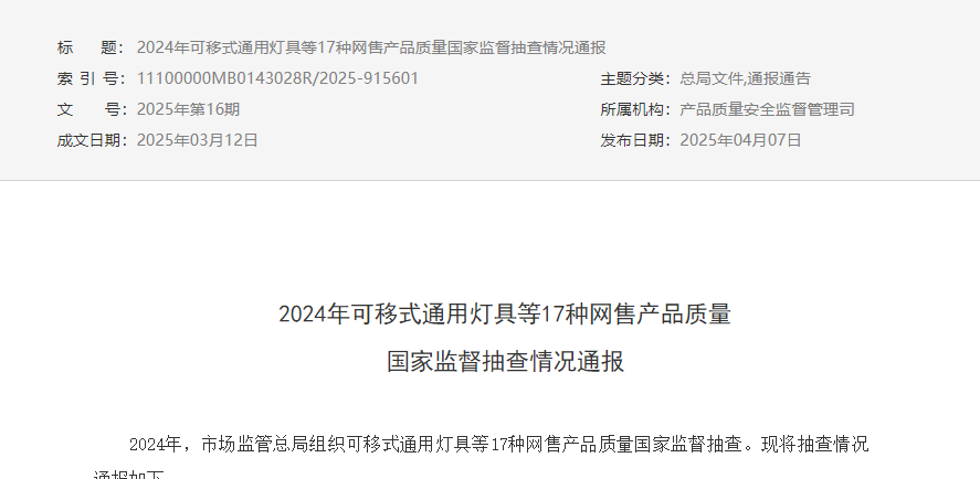 2024年可移式通用灯具等17种网售产品质量国家监督抽查