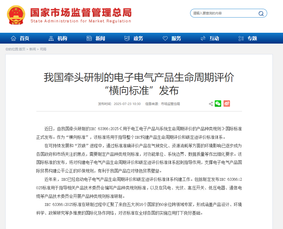 小编从国家市场监督管理总局官网获悉,近日,由我国牵头研制的IEC 63366:2025《用于电工电子产品与系统生命周期评价的产品种类规则》国际标准正式发布。作为“横向标准”,该标准将用于指导整个IEC构建产品生命周期评价和碳足迹评价标准体系。