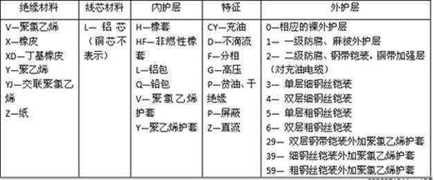 第四组是一个字母组成,表示内护套,比如Q表示铅包 L表示铝包